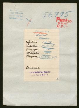 La carta fechada el 21-05-1917, que inicia el expediente, firmada por L. Krafft, de la Ligue Patriotique des Françaises, remite las fichas FRB 056651 a FRB 506979 y FRB 057001 a FRB 057100, y se encuentra en el expediente cuya signatura es 27617/001: http://10.14.168.24/index.php/expediente-de-celestin-jules-francois-delavente