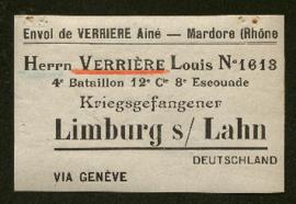 Contiene etiqueta de envíos al prisionero con la dirección del campamento en el que se encuentra recluido