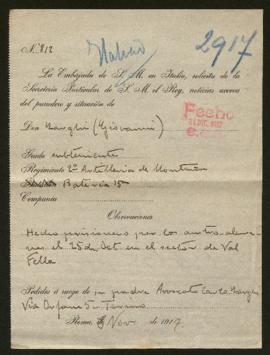 El expediente incluye un documento tipo de la Embajada de España en Roma solicitando noticias del alférez Giovanni Zarghi, pero no se conserva la carta de petición