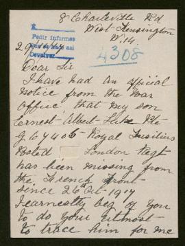 Los datos aportados en la carta no permiten determinar el lugar de desaparición. Además, puesto que el número de batallón al que pertenecía el militar objeto de búsqueda fue censurado, tampoco puede conocerse a través de una fuente externa.