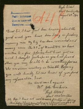 Los datos aportados en la carta no permiten determinar el lugar de desaparición. Además, puesto que el número de batallón al que pertenecía el militar fue censurado, tampoco puede conocerse a través de una fuente externa.
