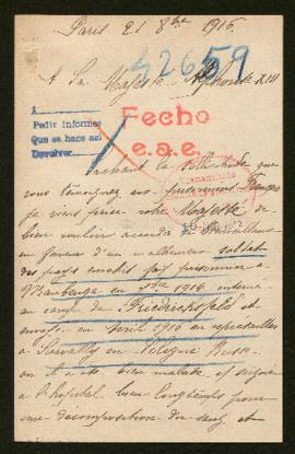 En el resultado de las gestiones en la ficha normalizada de la Oficina hay una nota mecanografiada que dice que después de la información de las autorizaciones militares alemanes será presentado a la próxima comisión de revisión para su internamiento en el país neutral en Suiza